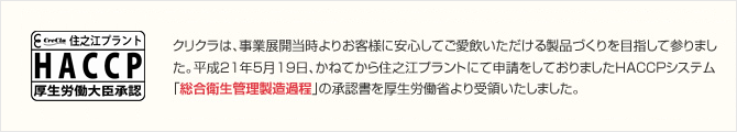 クリクラ住之江プラントでは、お客様に、より安心・安全なクリクラの提供を目指し、施設設備の設計段階からHACCPシステムを導入、平成20年6月の操業開始当初より『総合衛生管理製造過程』の承認に向け、HACCP自主管理委員会による従業員教育や研修会の開催、社内監査等を重ね、HACCPシステムの検証を行いながら稼動して参りました。