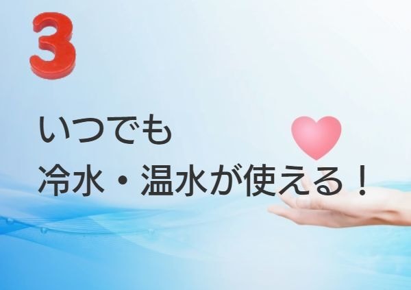 冷たいお水も、お茶やコーヒー、ミルクに便利なお湯も待たずにすぐ使えます。