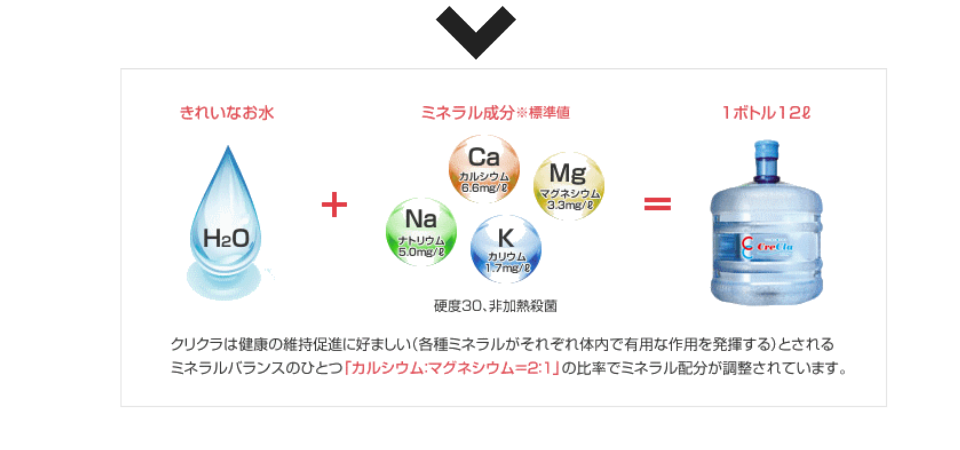 日本の水はミネラルがほどよく含まれ、クセのない口あたりの軟水です。クリクラのお水も、日ごろから飲み慣れている軟水の味。適度なミネラルバランスで、まろやかなおいしさが評判です。