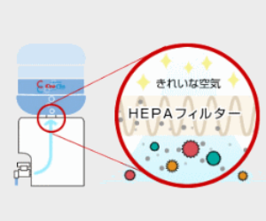 使うたびにボトル内にボコボコッと入る空気も、HEPAフィルターを通しているのでとっても安心。HEPAフィルターは空気中のゴミ・粉塵を99.97%除去できます。クリクラなら、きれいでおいしいお水を安心して飲む事ができます。