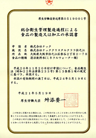 クリクラ住之江プラントでは、お客様に、より安心・安全なクリクラの提供を目指し、施設設備の設計段階からHACCPシステムを導入、平成20年6月の操業開始当初より『総合衛生管理製造過程』の承認に向け、HACCP自主管理委員会による従業員教育や研修会の開催、社内監査等を重ね、HACCPシステムの検証を行いながら稼動して参りました。